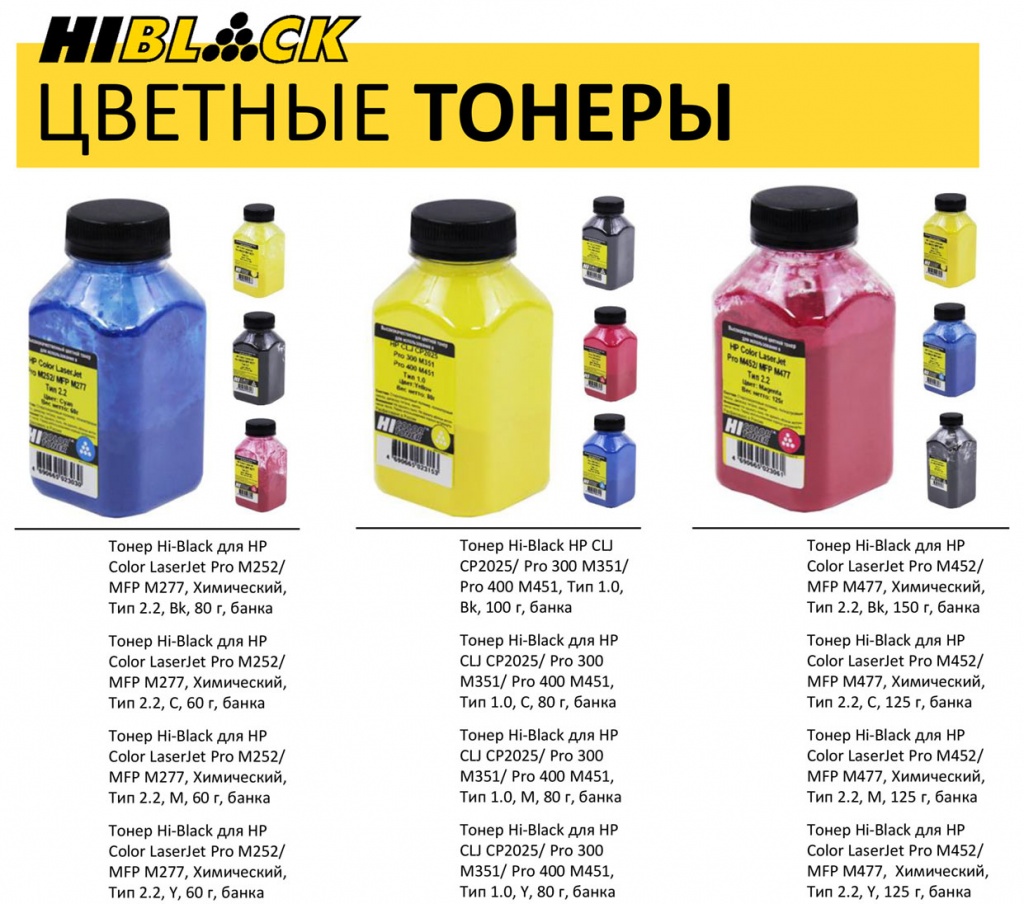 Тонер Hi-black HP CLJ CP2025 / Pro300 M351 / Pro 400 M451 Тип 1.0 Y, 80г.