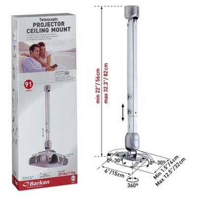 Кронштейн для потолочного крепления LCD проекторов, телевизоров и мониторов Barkan 91.S до 26" (66 см), телескопический, 2 регулировки положения (верх-вниз - поворот 36