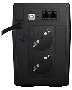 850VA/480W, 2 евророзетки, время переключения: 2-6 мс, max: 10 мс, время подзарядки: 4-6 часов до 90% мощности, уровень шума: 40 дБ; USB; ЖК индикатор: вх./вых. напряжение, режим работы от сети переменного тока