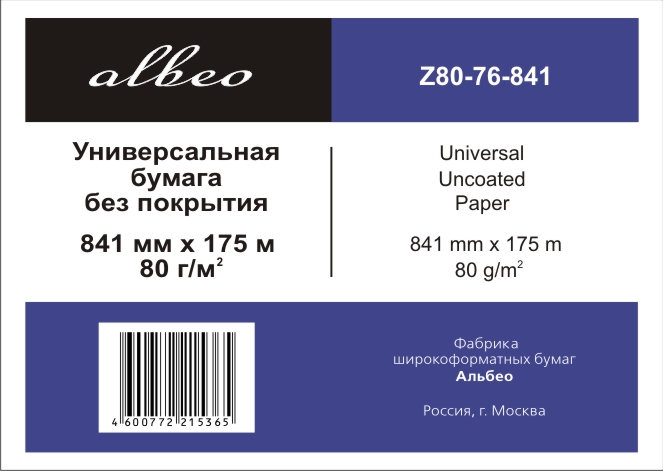 Основные характеристики: Артикул: Z80-76-841 Плотность: 80 г/м2 Длина намотки (рулона) 175 м Ширина: 841мм Белизна: 146 Рулонов в упаковке: 2шт. Втулка 76,2мм (3”) Область применения: бумага для инженерных систем используется для получения графических копий при монохромной печати Торговая марка: Albeo (Албео) Производитель: Альбео - Фабрика бумаг для плоттеров